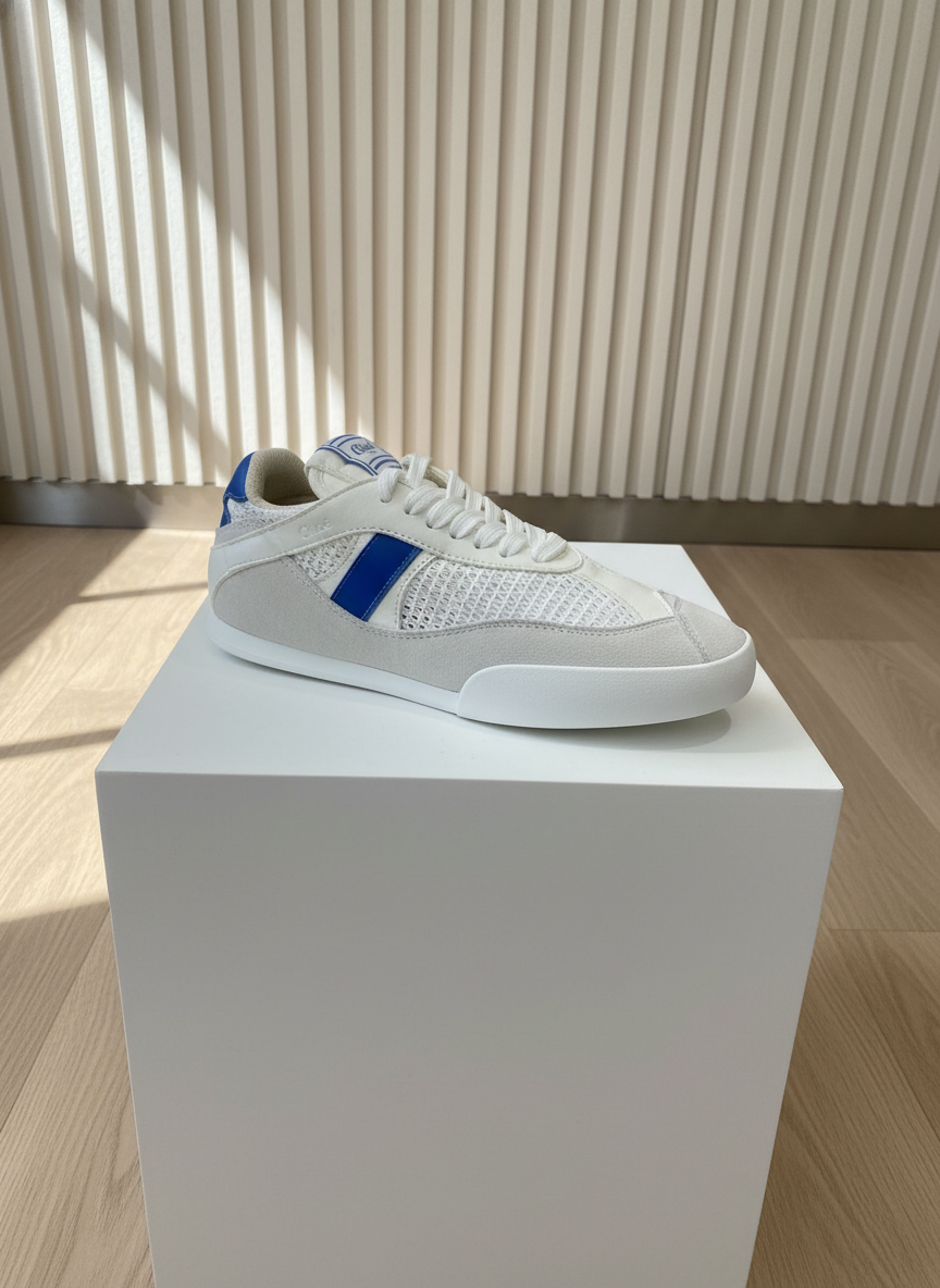 Chloe white mesh sneakers with blue stripe, suede accents, and rubber sole, offering stylish comfort and breathable design for casual wear.