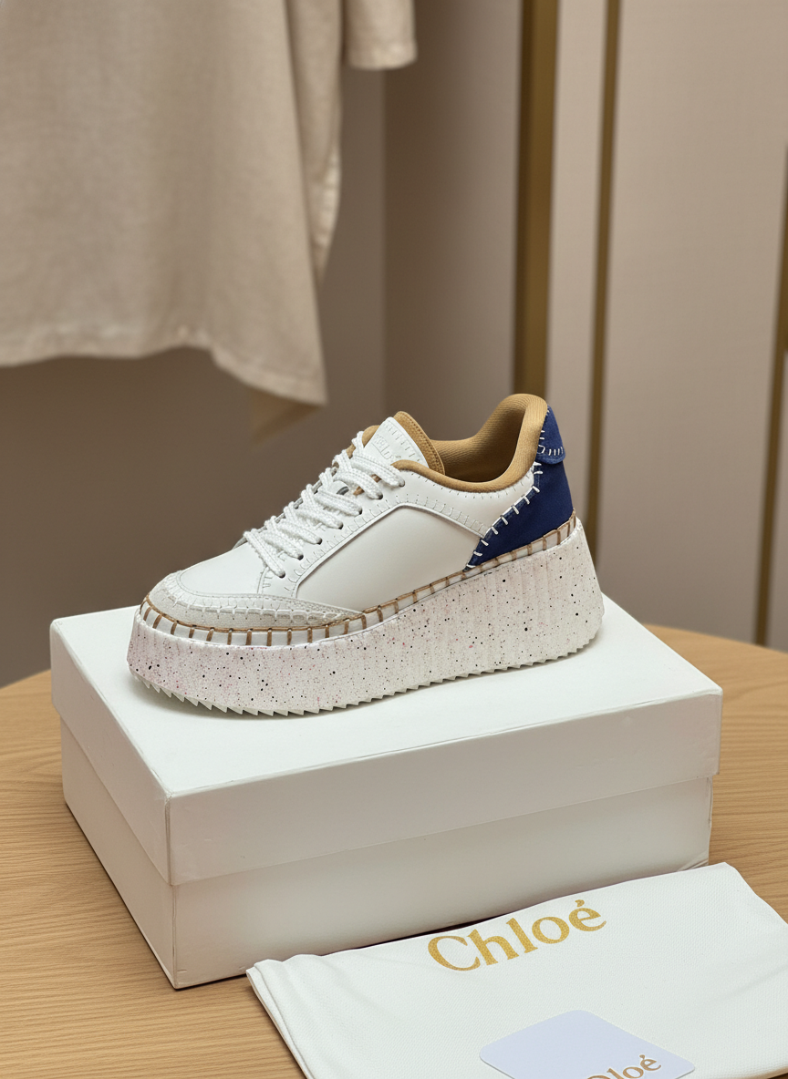 Chloé White Platform Sneakers with speckled sole, navy heel detail, and premium leather upper for stylish comfort and elevated casual fashion.