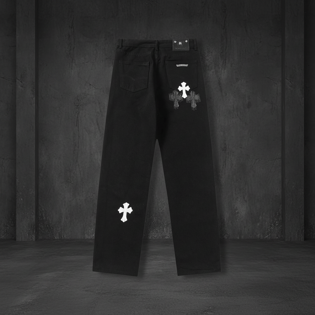 Chrome Hearts Black Pants with signature cross patch design, premium streetwear style, perfect for casual or edgy fashion outfits.