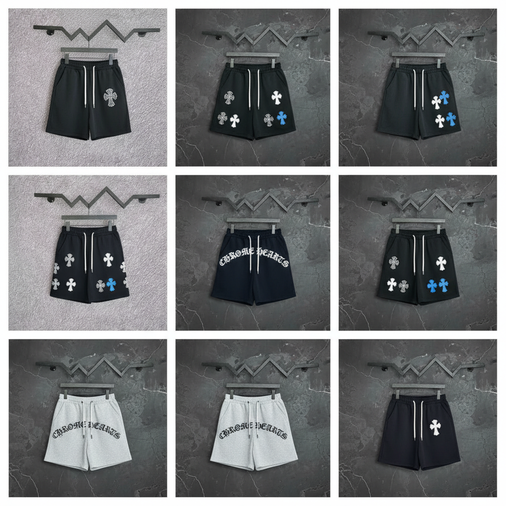 Chrome Hearts men’s casual shorts, trendy streetwear style with signature cross and logo prints, comfortable cotton fabric perfect for summer fashion.