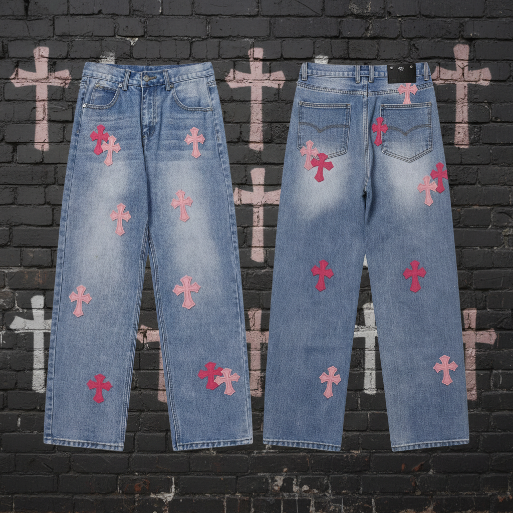 Chrome Hearts denim jeans with pink cross patches, stylish straight-leg design, premium quality streetwear for fashion-forward look.