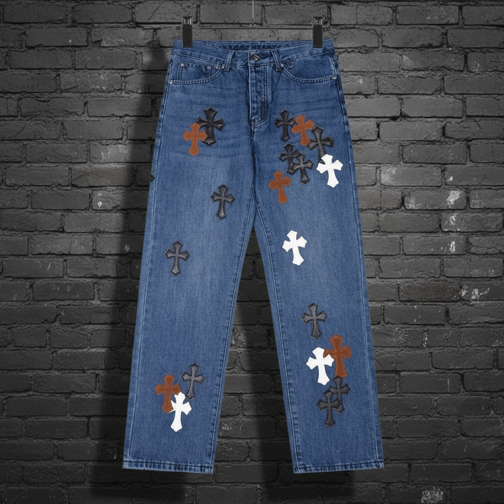 Chrome Hearts jeans featuring multicolor cross patch design, premium blue denim, stylish streetwear fashion for men and women, perfect for casual and hip-hop outfits.