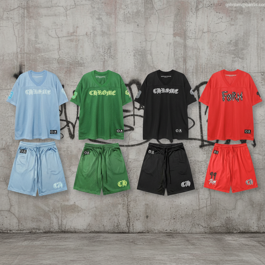 CHROME stylish sportswear set, breathable mesh T-shirt and shorts, perfect for workout, running, and casual streetwear in multiple colors.