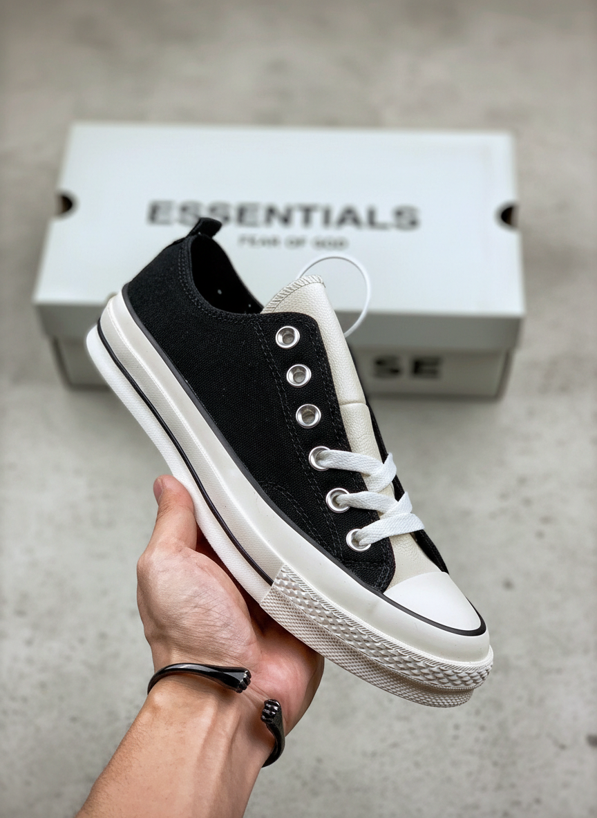 Converse Essentials Low Top Sneakers, black and white canvas, classic lace-up design, durable rubber sole, unisex casual shoes for streetwear and everyday comfort.