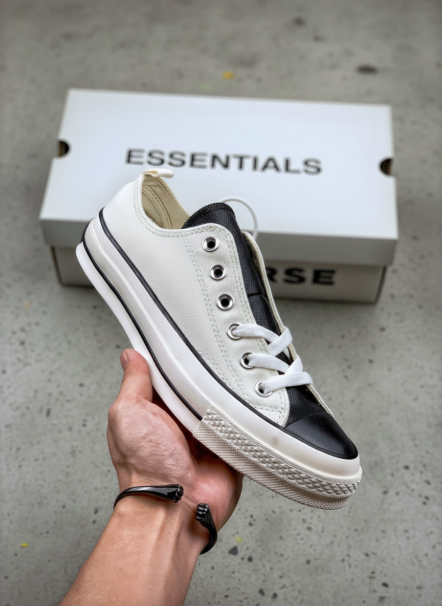 Converse Essentials Low Top Sneakers, black and white canvas, classic lace-up design, durable rubber sole, stylish casual shoes for everyday wear.