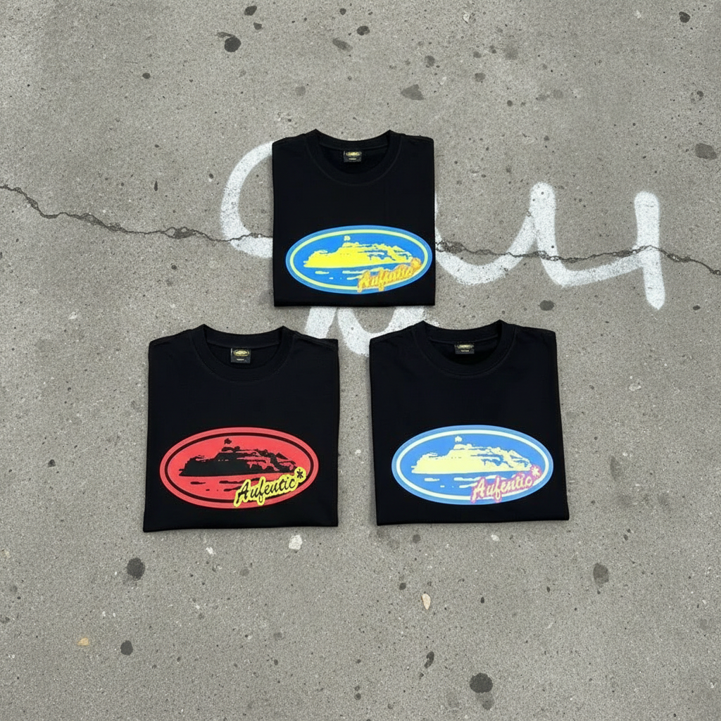 Corteiz Authentic graphic black T-shirt with vibrant cruise ship print, available in red, blue, and yellow designs for bold streetwear style.
