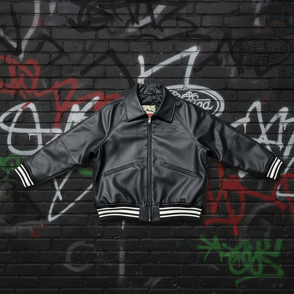 Corteiz Black Leather Bomber Jacket