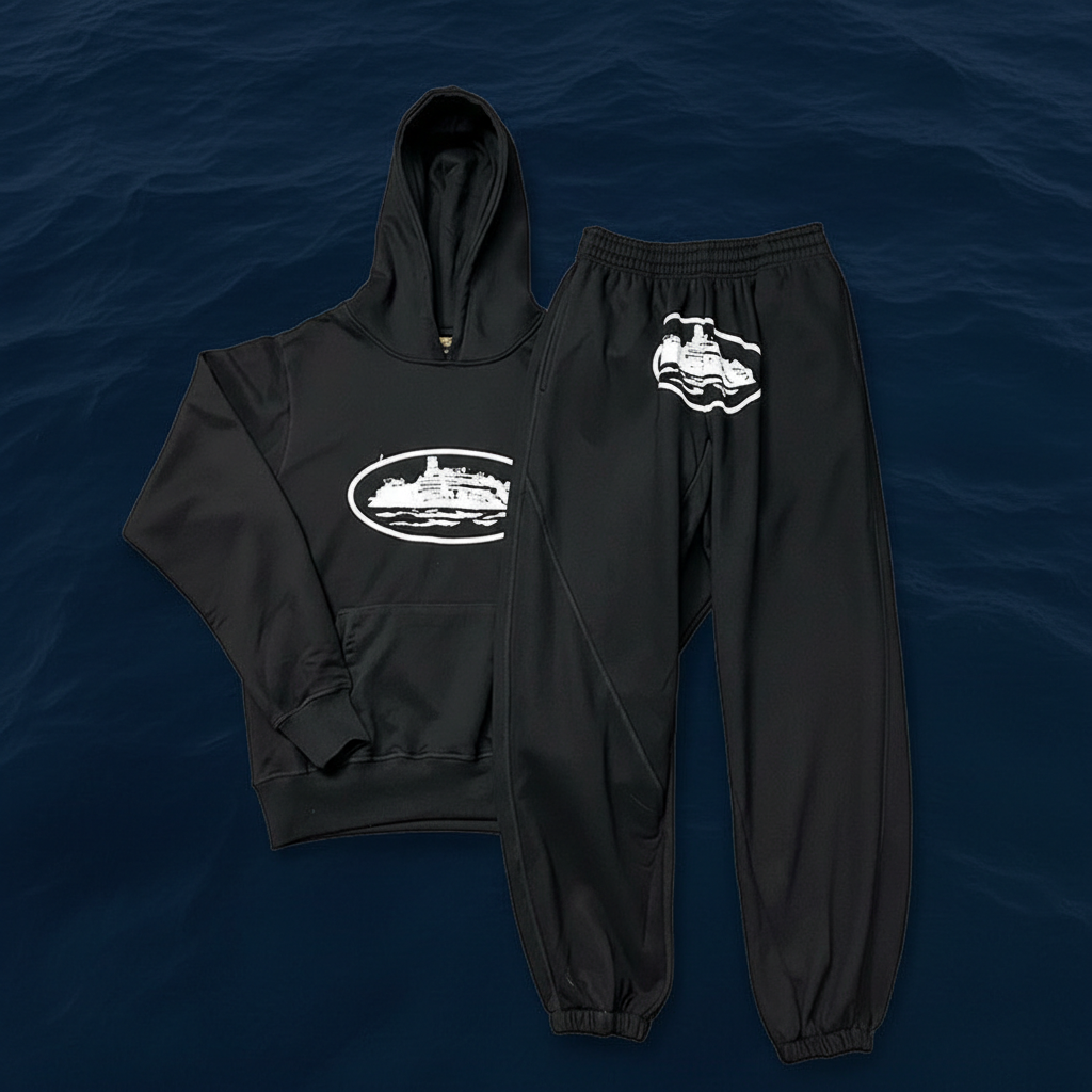 Corteiz hoodie and jogger set in black, featuring iconic graphic design, soft fabric, and a casual fit perfect for streetwear style and all-day comfort.