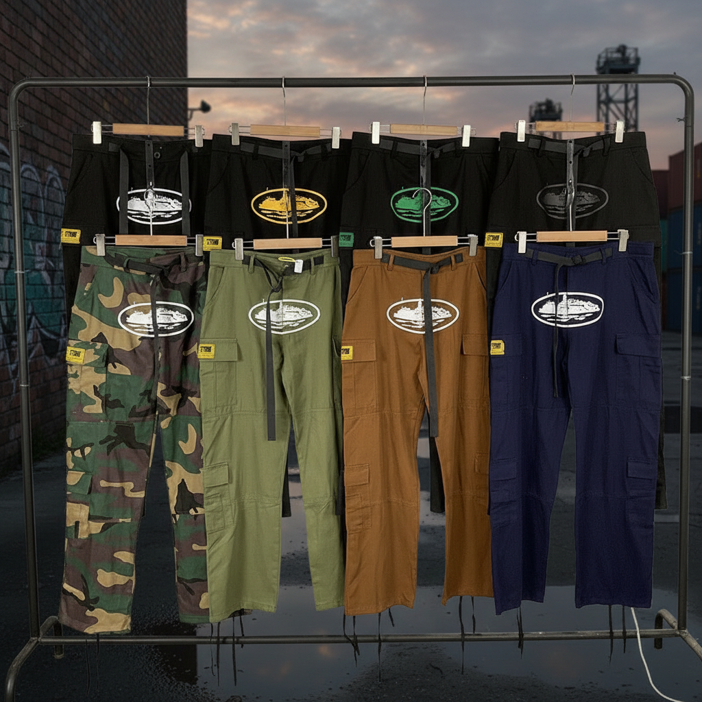 Corteiz cargo pants with multi-pocket design, streetwear style, durable fabric, perfect for outdoor, casual, and urban fashion in various colors including camo, black, green, brown, and navy.