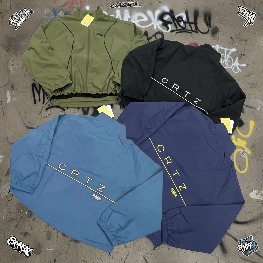 Corteiz stylish windbreaker jackets in black, blue, navy, and green, featuring bold CRTZ logo design, perfect for streetwear and casual fashion.