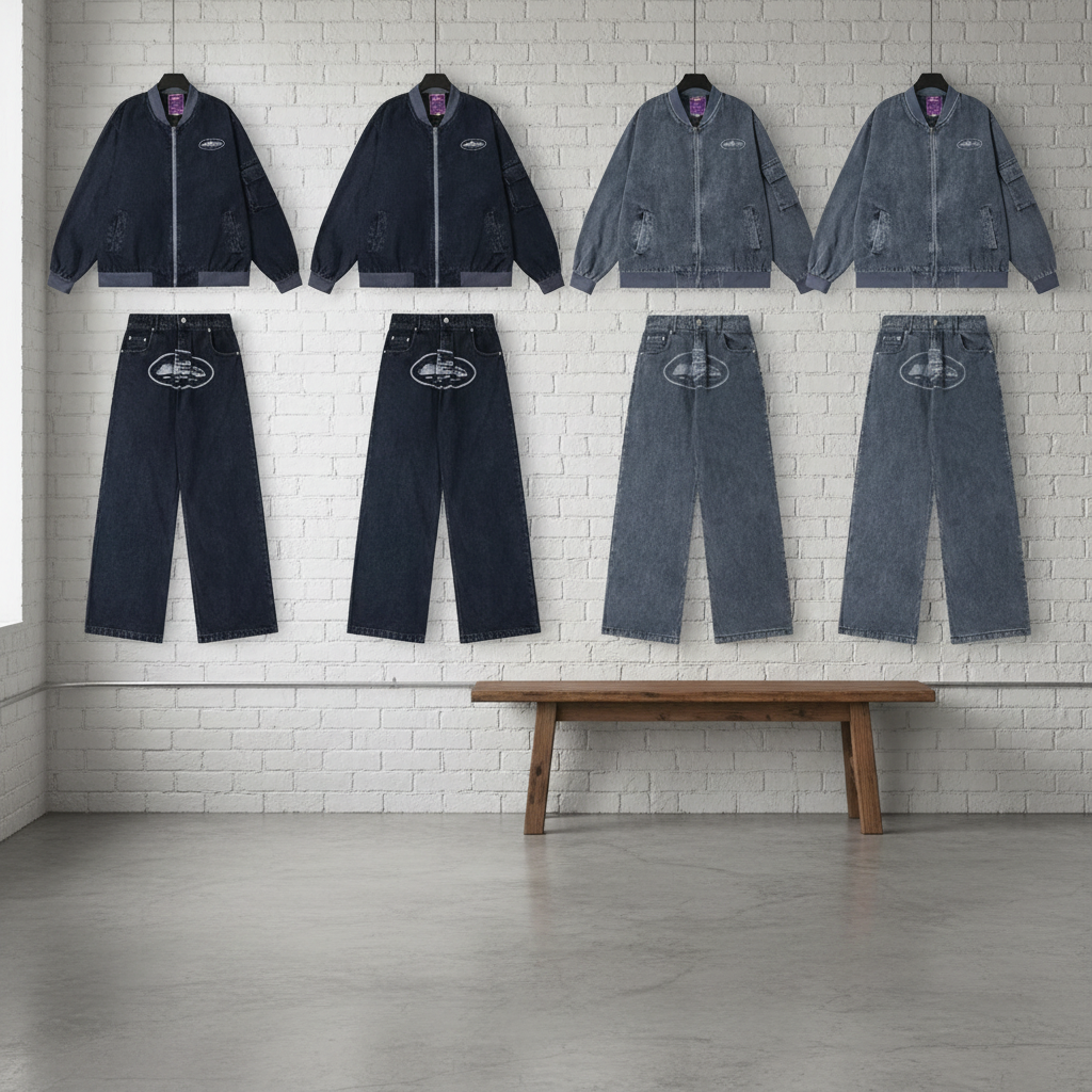 Corteiz denim jacket and wide-leg jeans set, stylish streetwear design with signature logo, durable fabric, perfect for casual and urban fashion.