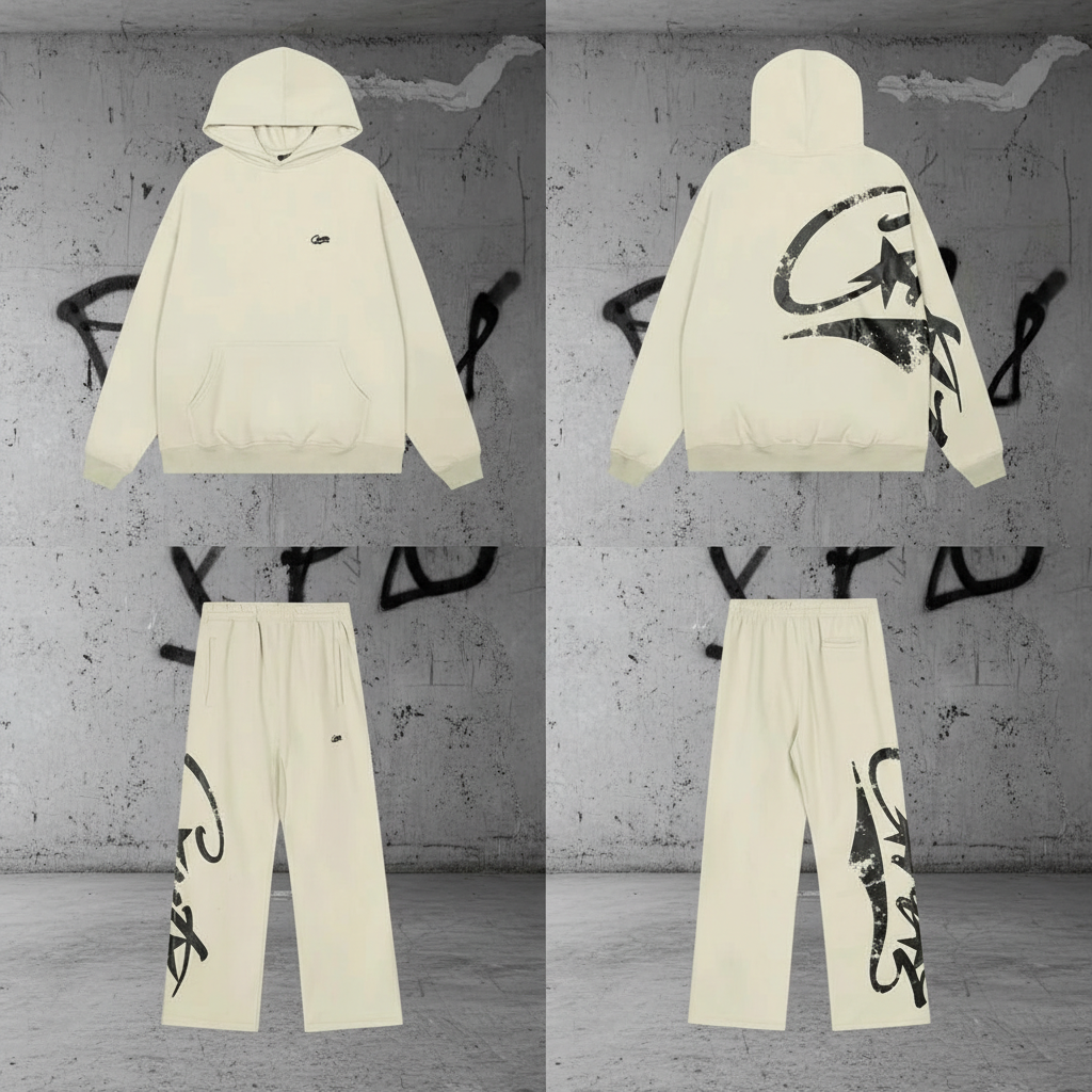 Corteiz Hoodies Set – stylish beige hoodie and sweatpants with bold graffiti logo, comfy cotton blend, perfect for streetwear, casual fashion, and urban style lovers.