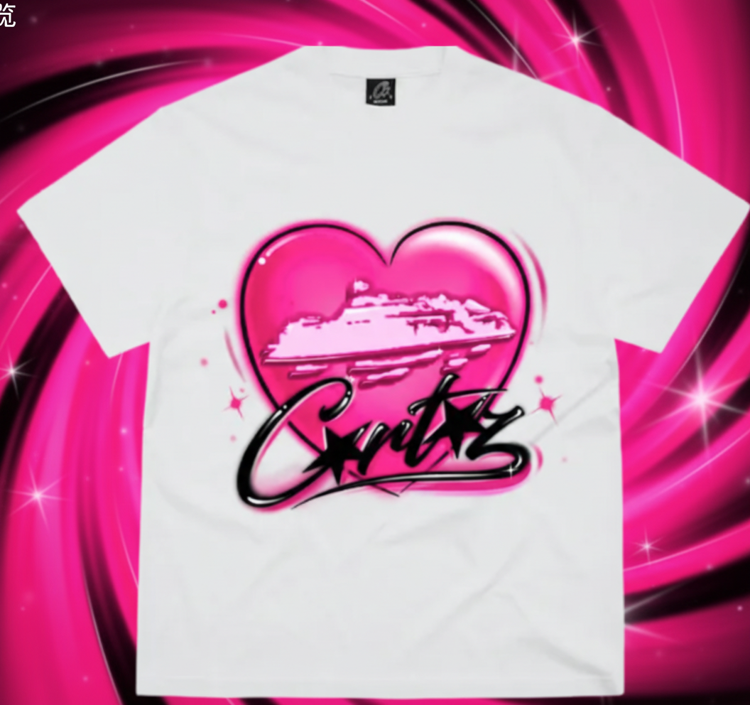 Corteiz White T-Shirt with Pink Heart Cruise Ship Graphic, Stylish Streetwear Top for Casual Wear