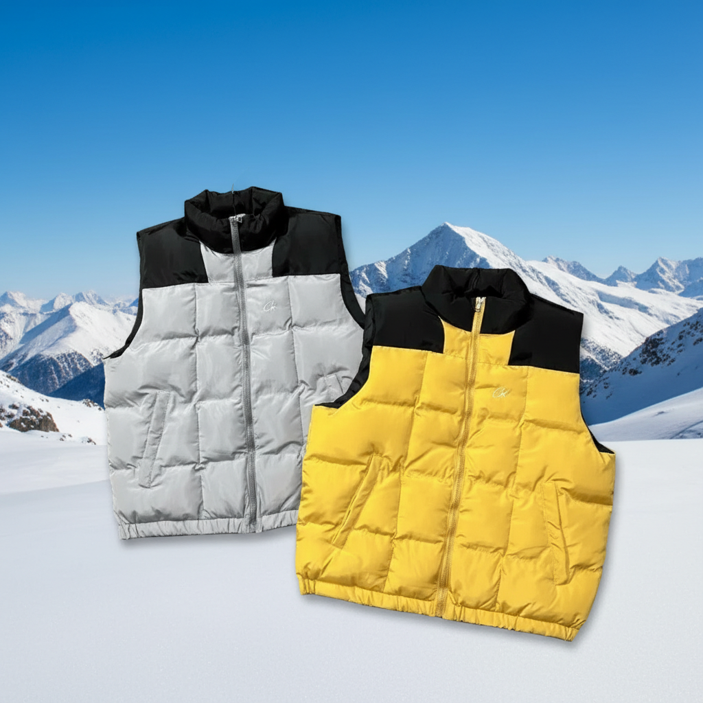Corteiz Puffer Vest, sleeveless winter jacket, color block design, lightweight and warm, ideal for outdoor sports, hiking, casual wear in cold weather.