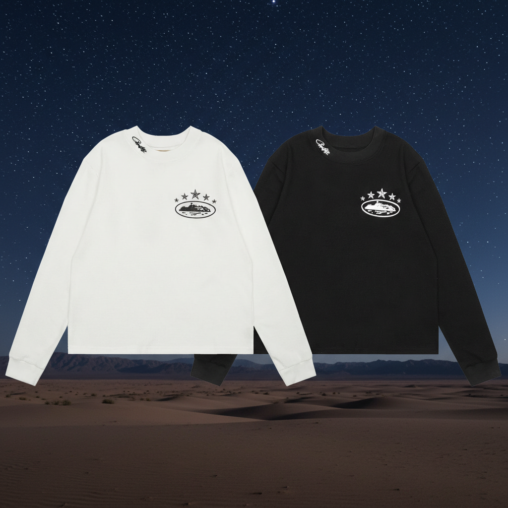 Corteiz long sleeve T-shirts with star and logo print, available in classic black and white, perfect for casual streetwear style and all-season comfort.