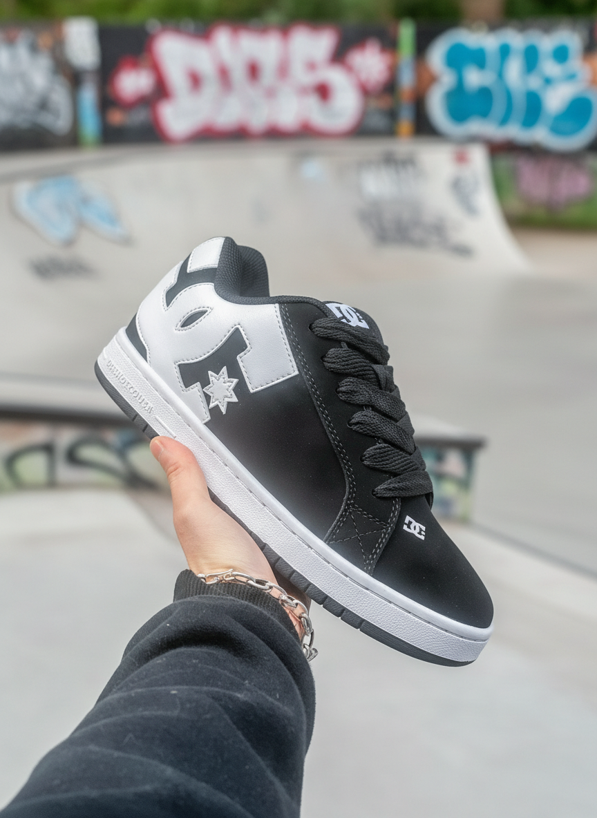 DCSHOECOUSA Black White Skate Shoes, durable rubber sole, stylish streetwear sneakers for men, sizes 36-45, perfect for casual and sport use.
