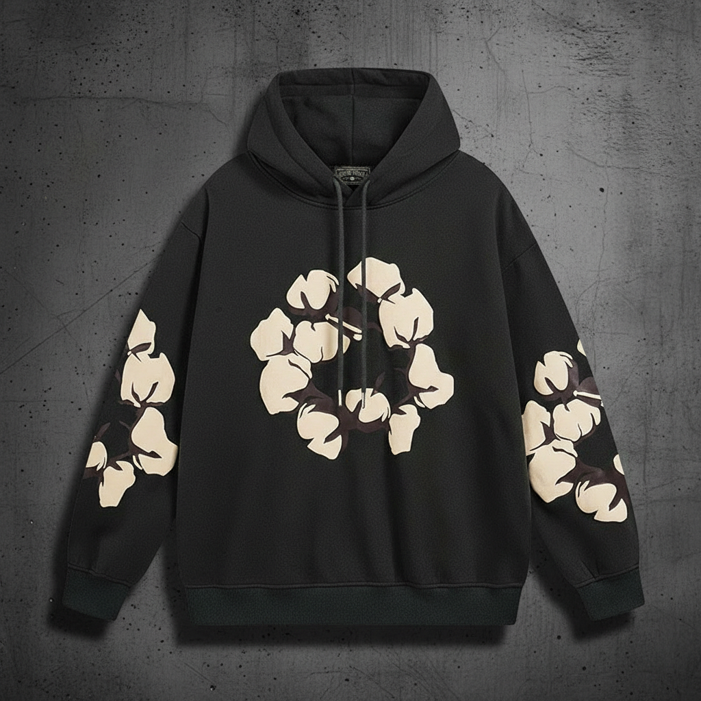 Denim Tears Cotton Wreath Hoodie, black pullover sweatshirt with signature floral print on chest and sleeves, premium streetwear fashion for men and women.
