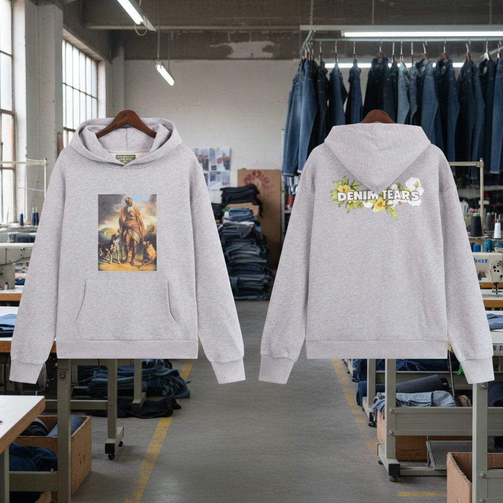 Denim Tears Hoodie Grey Cotton Pullover with Artistic Print and Floral Logo, Streetwear Style, Comfortable Fit, Trendy Unisex Casual Sweatshirt for Everyday Wear.