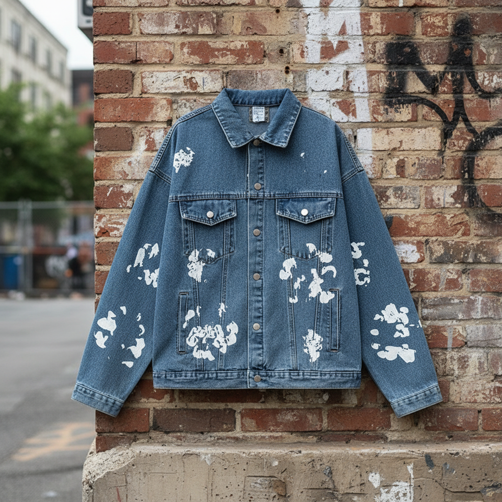 Denim Tears men’s distressed paint-splatter denim jacket, streetwear style, casual fit, vintage wash, perfect for urban fashion and everyday wear.