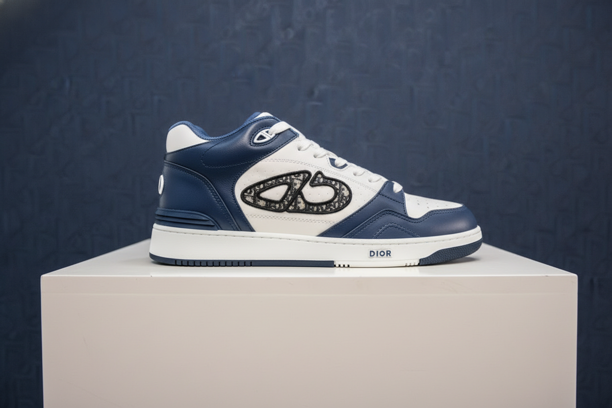 Dior Men’s Blue White Leather Sneakers, stylish high-top design with signature CD monogram, premium craftsmanship for fashion and comfort.