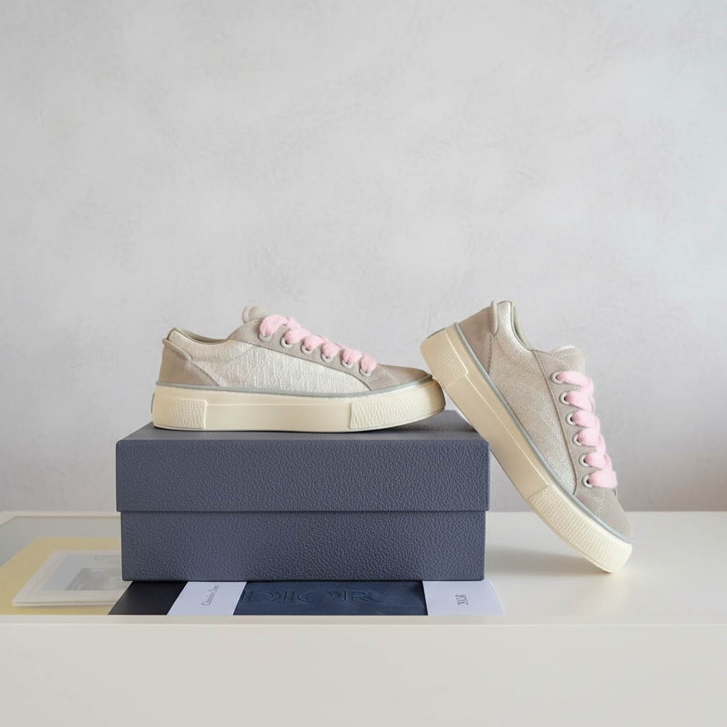 Dior Women’s Beige Platform Sneakers with Pink Laces, Luxury Designer Casual Shoes, Comfortable Fashion Footwear for Everyday Wear