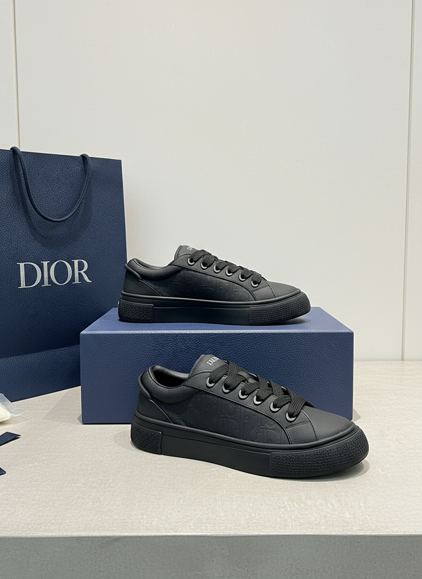 Dior Black Leather Sneakers feature sleek design, embossed logo details, durable rubber sole, and stylish comfort perfect for casual or streetwear fashion.