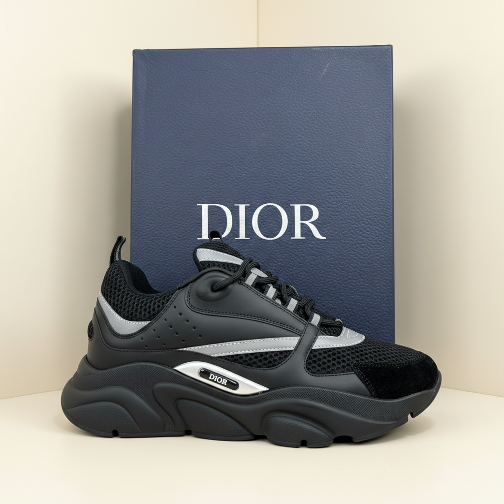 Dior Men’s Black Mesh Leather Sneakers, luxury designer chunky sole shoes for stylish comfort and premium casual wear.