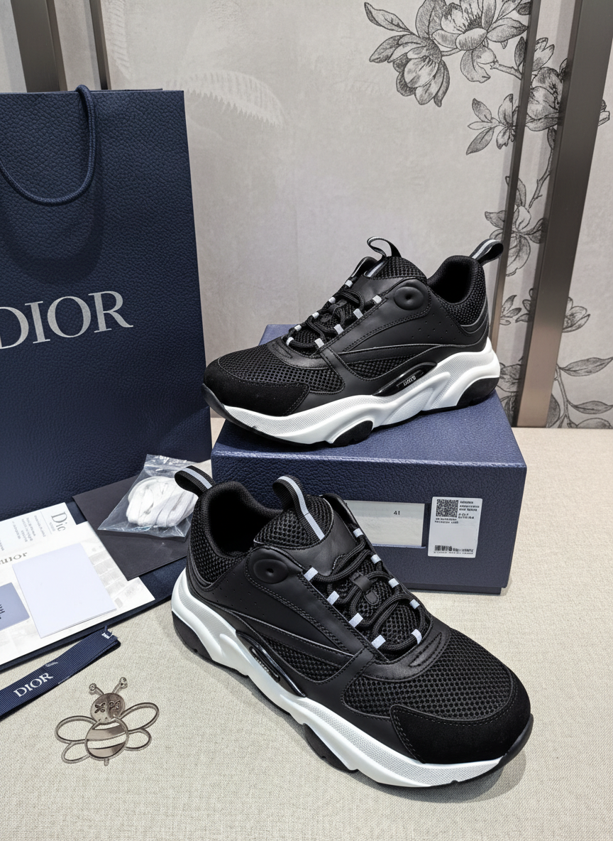 Dior Black Mesh Leather Sneakers, stylish chunky sole design, breathable comfort, perfect for casual wear and sports, luxury fashion footwear for men.