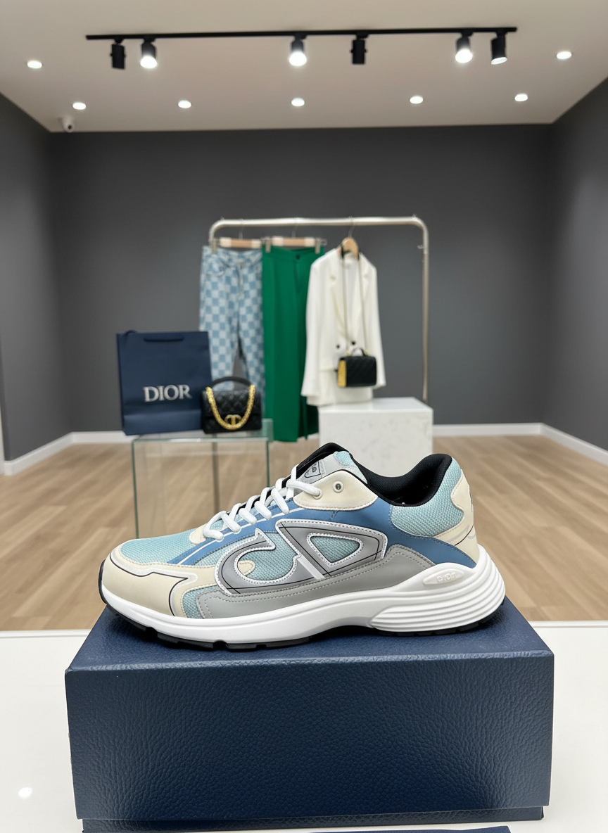 Dior Men’s Retro Runner Sneakers in Blue and Grey, featuring premium leather and mesh design, cushioned sole for comfort, and stylish sporty elegance for everyday wear.