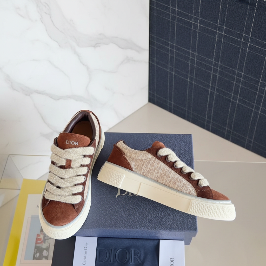 Dior Women’s Casual Sneakers, Brown Suede and Logo Canvas, Chunky White Sole, Fashion Comfort Lace-Up Shoes for Trendy Everyday Wear.