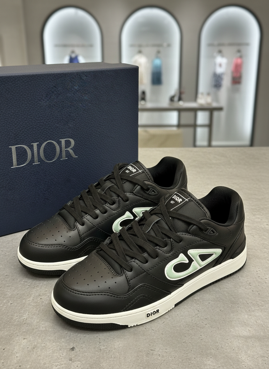 Dior black leather sneakers with white sole and green logo detail, stylish low-top design for casual wear and luxury fashion lovers.