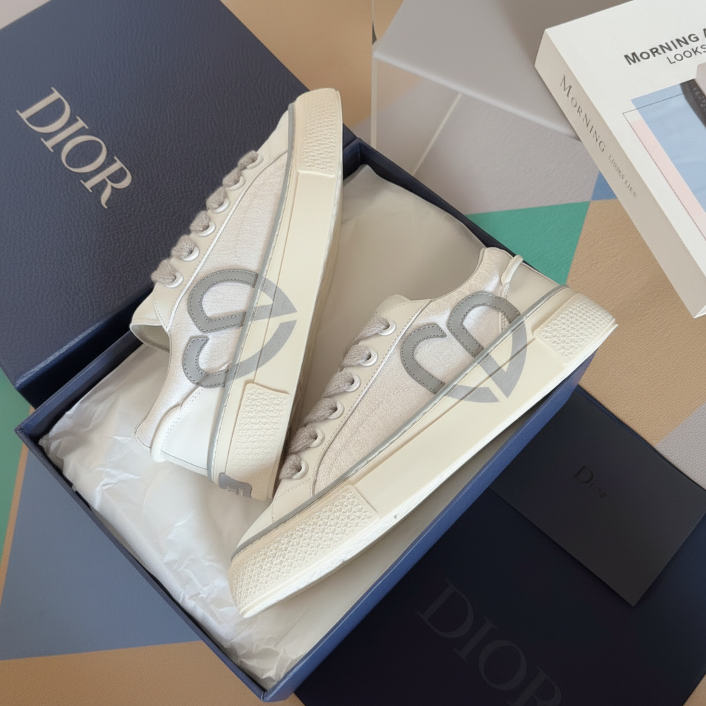 Dior luxury canvas sneakers with signature CD logo, white and gray design, durable rubber sole, stylish casual footwear for men and women.