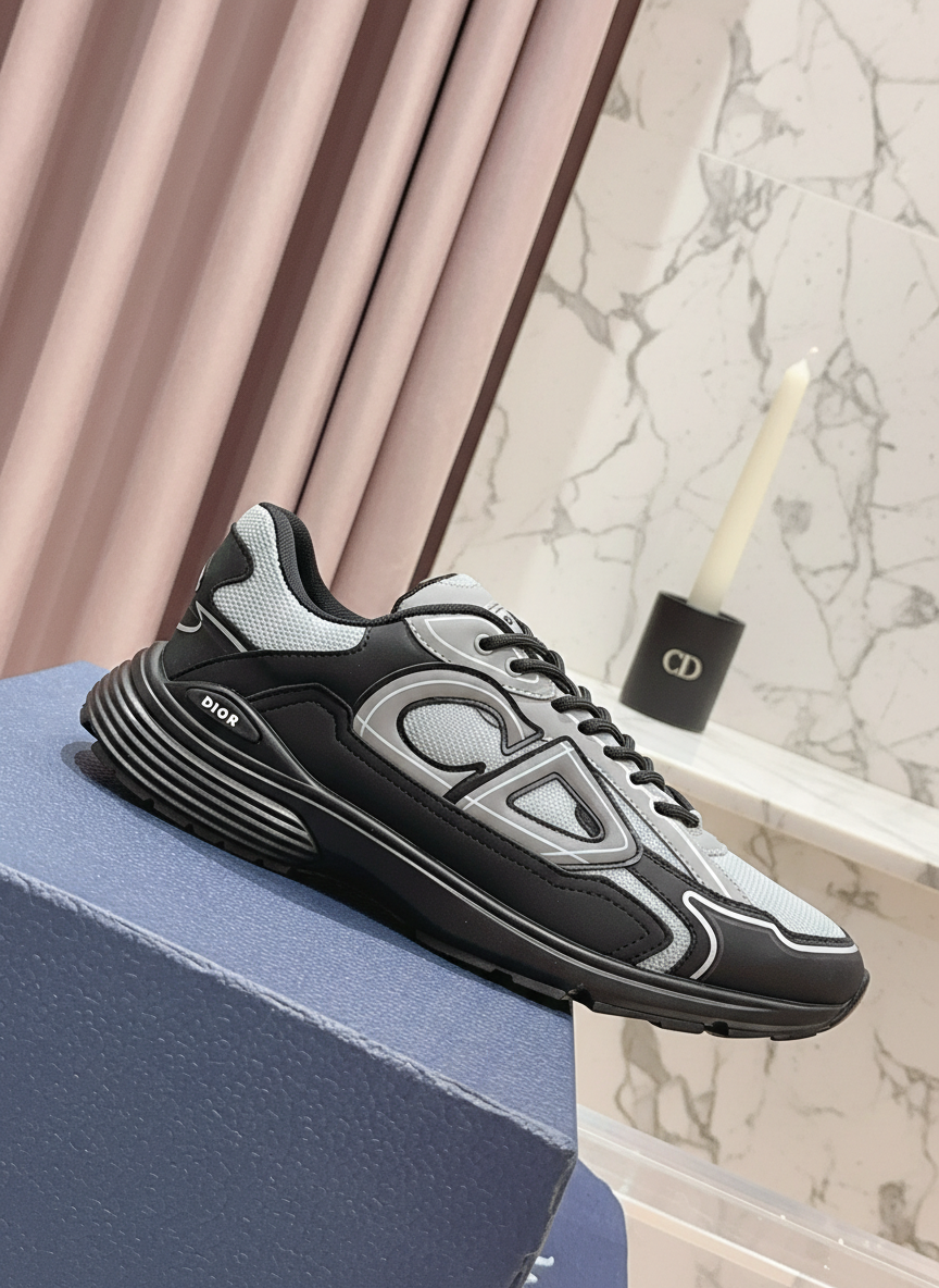 Dior men’s luxury sneakers, black and grey mesh with bold CD logo, lightweight design, perfect for casual wear and street style fashion.