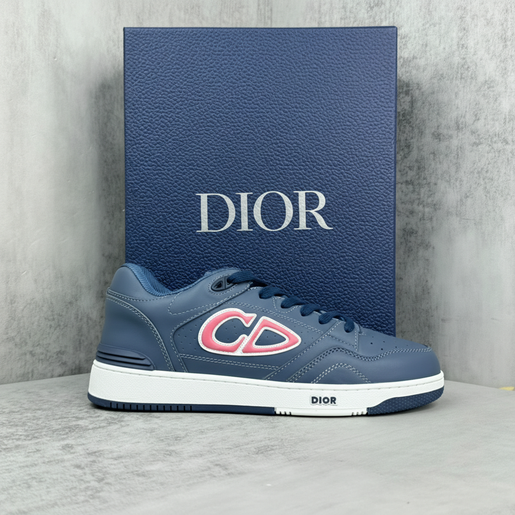 Dior Blue Leather Sneakers with Pink CD Logo, Stylish Low-Top Design, Premium Quality Casual Shoes for Men, Fashionable and Comfortable Everyday Footwear