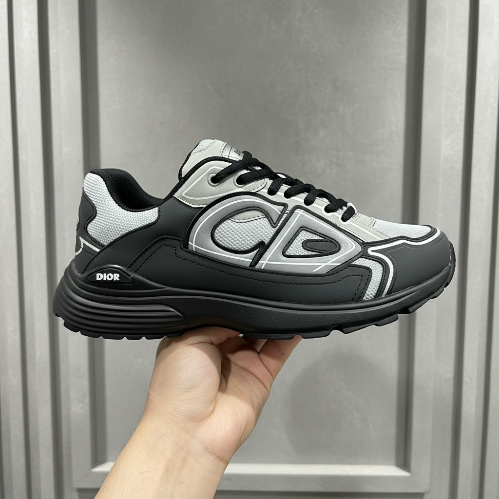 Dior Men’s Grey Black Sneakers, stylish lightweight design with breathable mesh and durable sole, perfect for casual wear and sports.