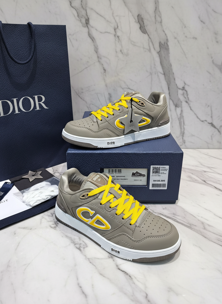 Dior CD low-top sneakers in grey leather with vibrant yellow laces, stylish design, and premium craftsmanship for casual and sporty wear.