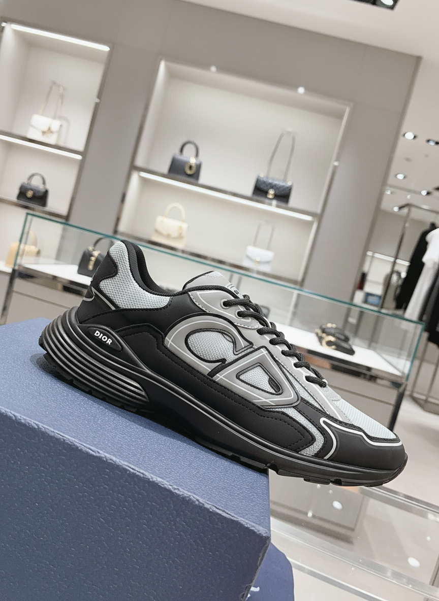 Dior Men’s Running Sneakers, stylish black and gray design with breathable mesh, lightweight sole, perfect for casual wear and sports activities.