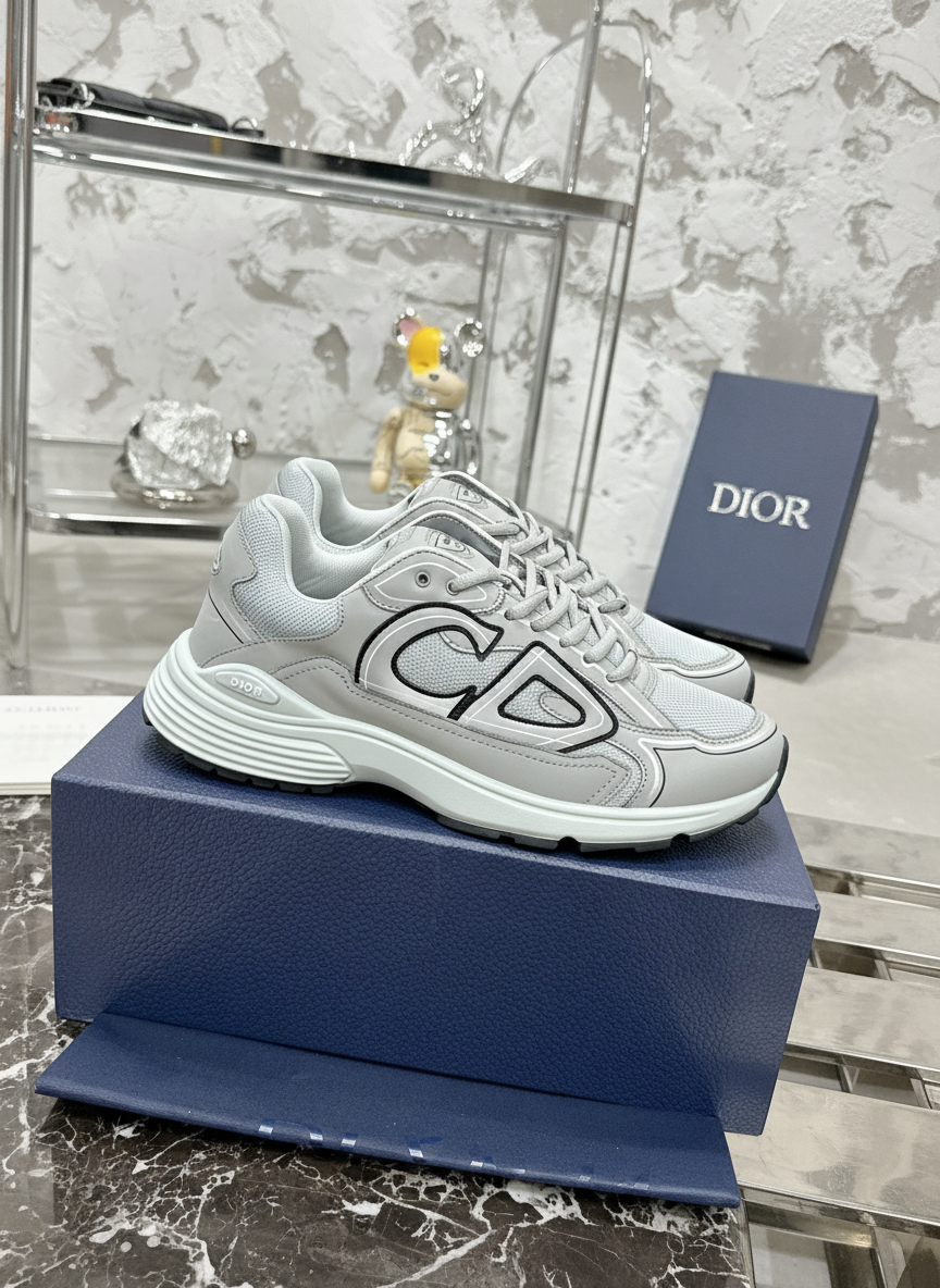 Dior men’s grey sneakers with bold CD logo, breathable mesh, premium leather accents, and cushioned sole for stylish comfort and everyday wear.