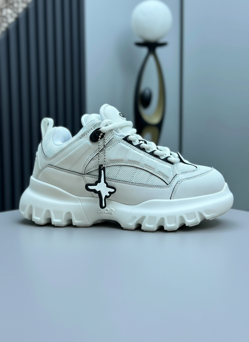 Dior luxury white chunky sneakers, stylish design with textured mesh and leather, durable sole for comfort, perfect for casual and streetwear fashion.
