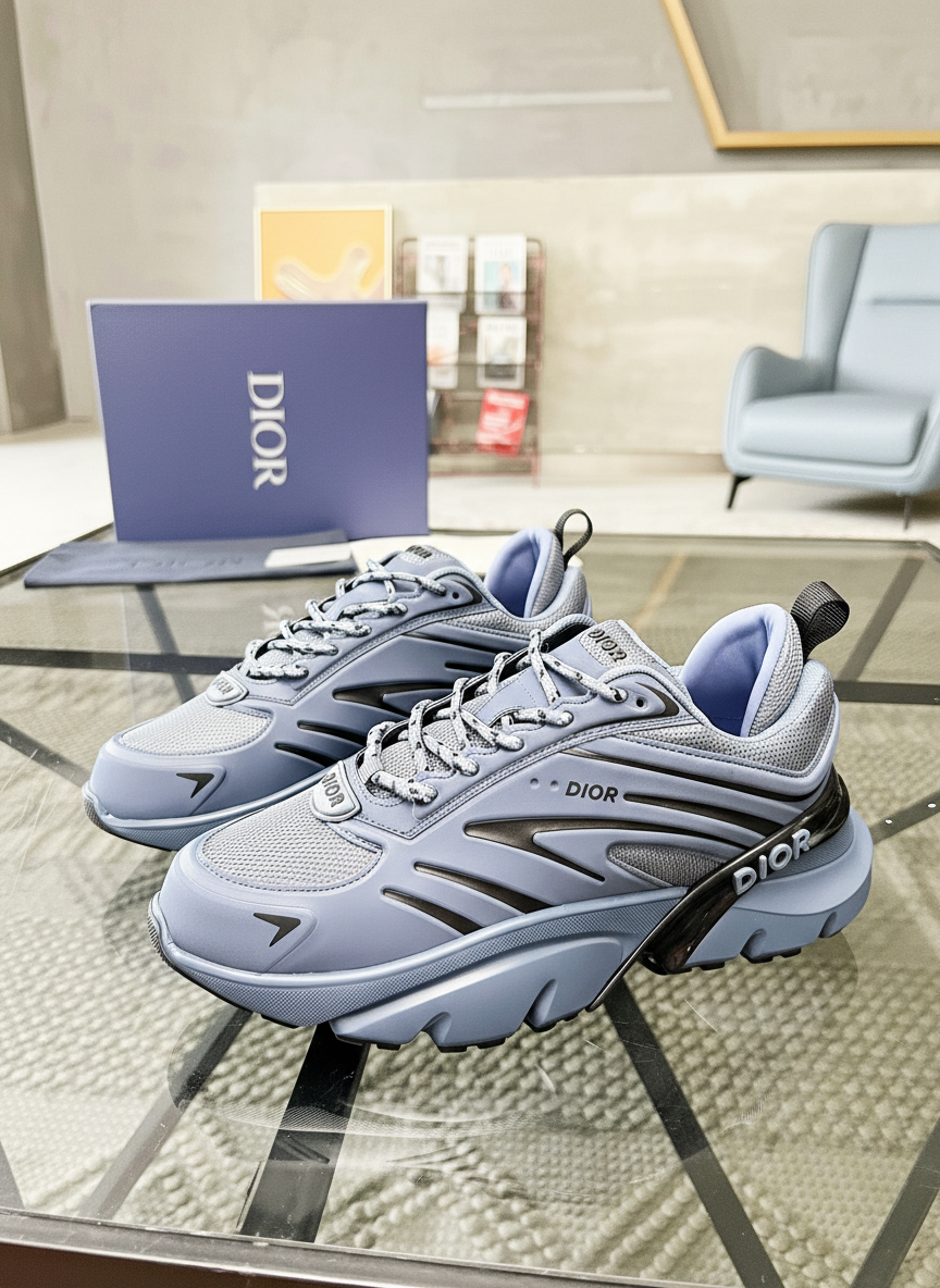 Dior Men’s Luxury Sneakers, stylish grey-blue design with mesh and leather accents, chunky sole, perfect for casual wear and street fashion.
