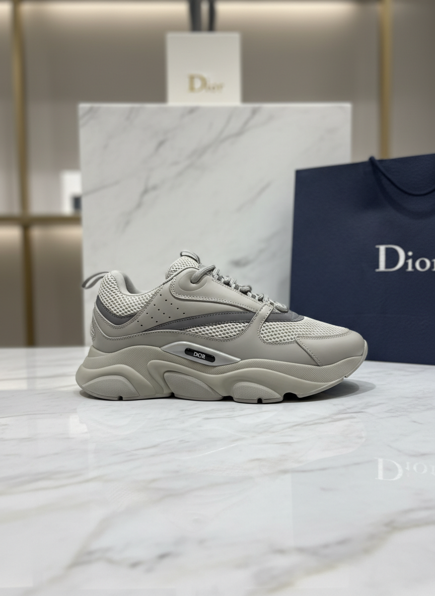 Dior Men’s Grey Chunky Sneakers, breathable mesh and leather upper, cushioned sole for comfort, stylish design perfect for casual and athletic wear.