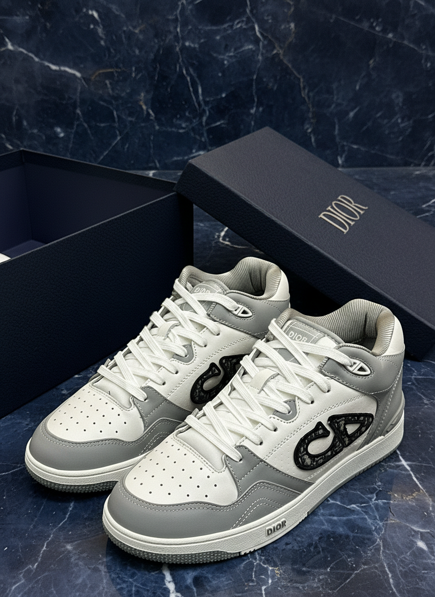 Dior Men’s Grey White Leather Sneakers, stylish low-top design with signature logo detail, perfect for casual wear and luxury street style.