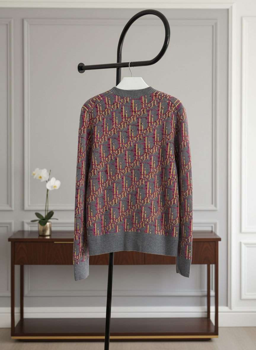 Dior Hoodie – Stylish grey knit with colorful logo pattern, perfect for casual wear, street style, and luxury fashion lovers worldwide.