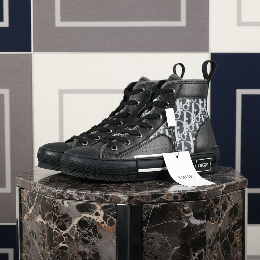 Dior high-top sneakers with signature monogram design, black lace-up closure, durable rubber sole, and modern streetwear style for men and women.