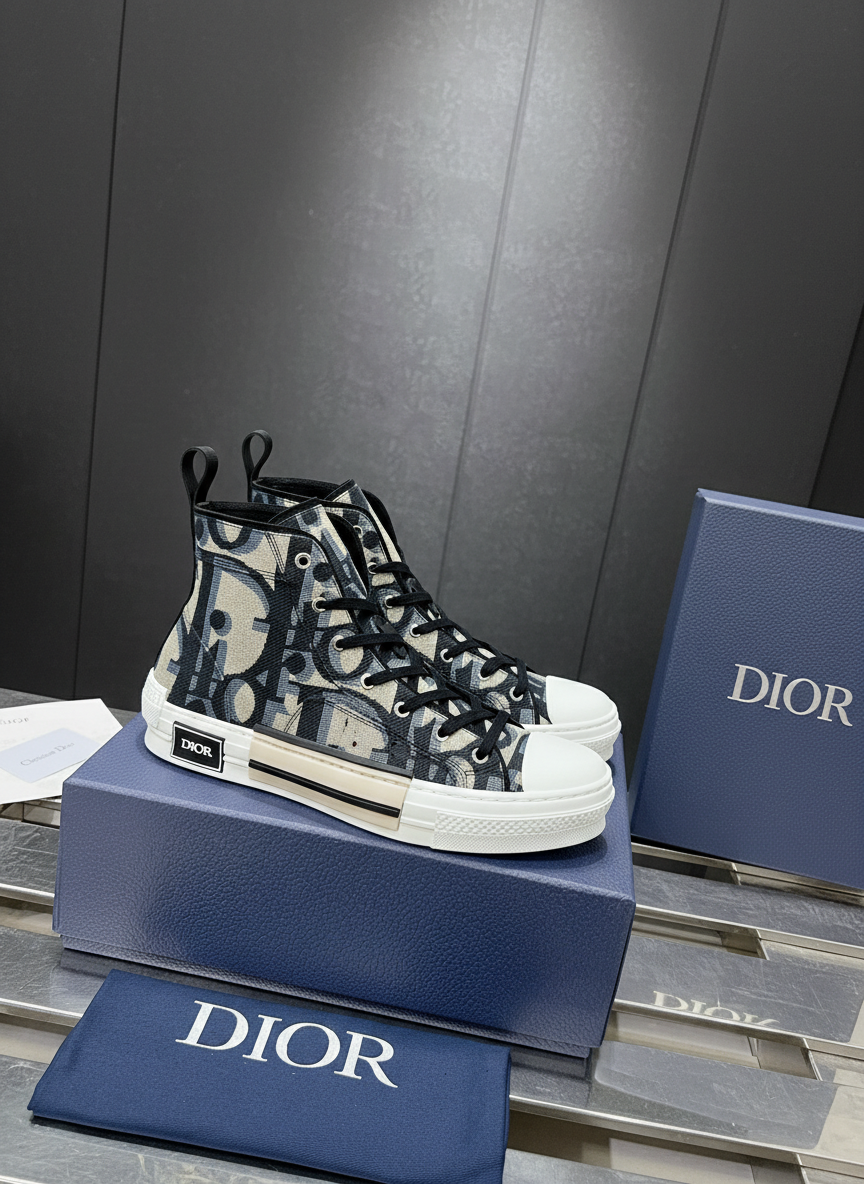 Dior High-Top Sneakers with iconic monogram canvas, lace-up design, durable rubber sole, and timeless luxury style for fashion-forward comfort.