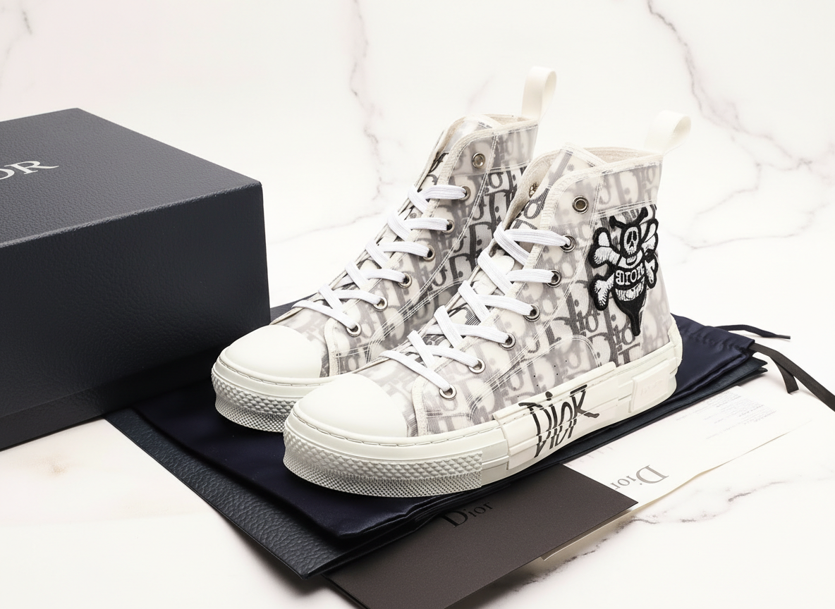 Dior High-Top Sneakers featuring iconic monogram print, skull embroidery detail, lace-up closure, and durable rubber sole for stylish comfort.