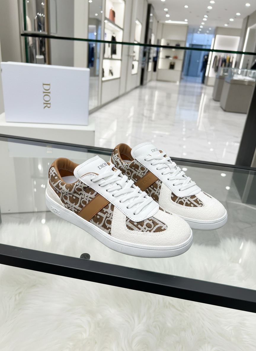 Dior luxury casual sneakers, white and brown monogram design, premium leather and fabric, stylish and comfortable for everyday wear.