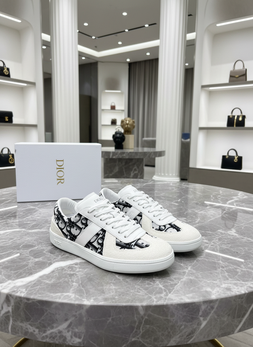 Dior men’s casual sneakers in white leather with signature black monogram detailing, stylish and comfortable for everyday wear and luxury fashion lovers.
