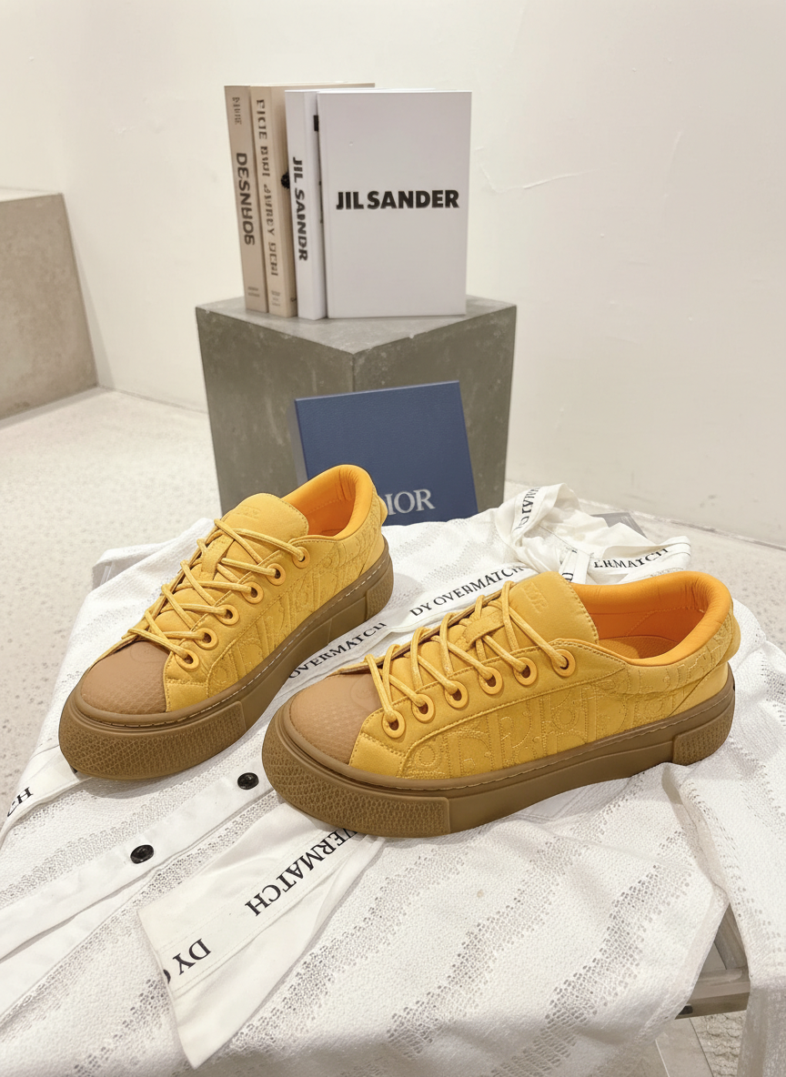Dior Yellow Low-Top Sneakers, stylish embossed design, durable rubber sole, perfect for casual wear and street fashion.