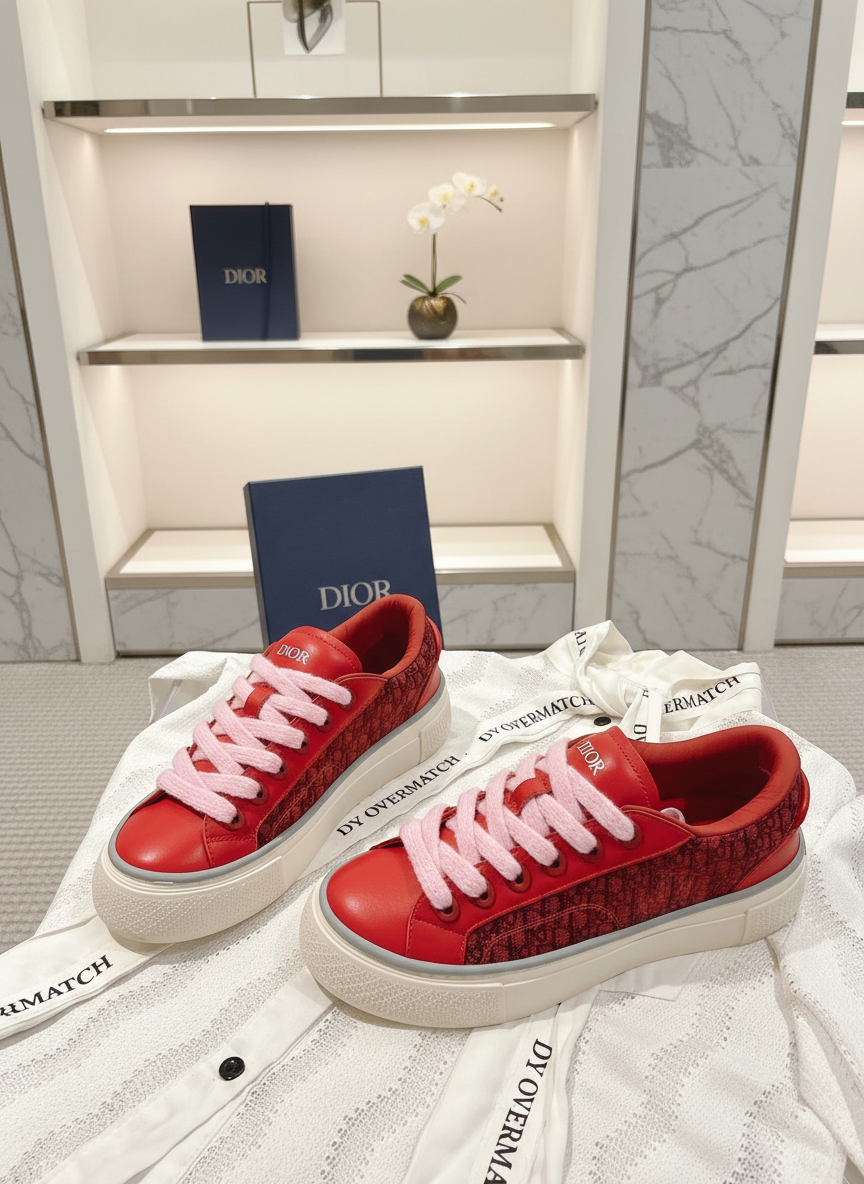 Dior Red Low-Top Sneakers with Pink Laces, Logo Pattern Design, Casual Luxury Shoes for Women, Fashionable Comfortable Streetwear Style